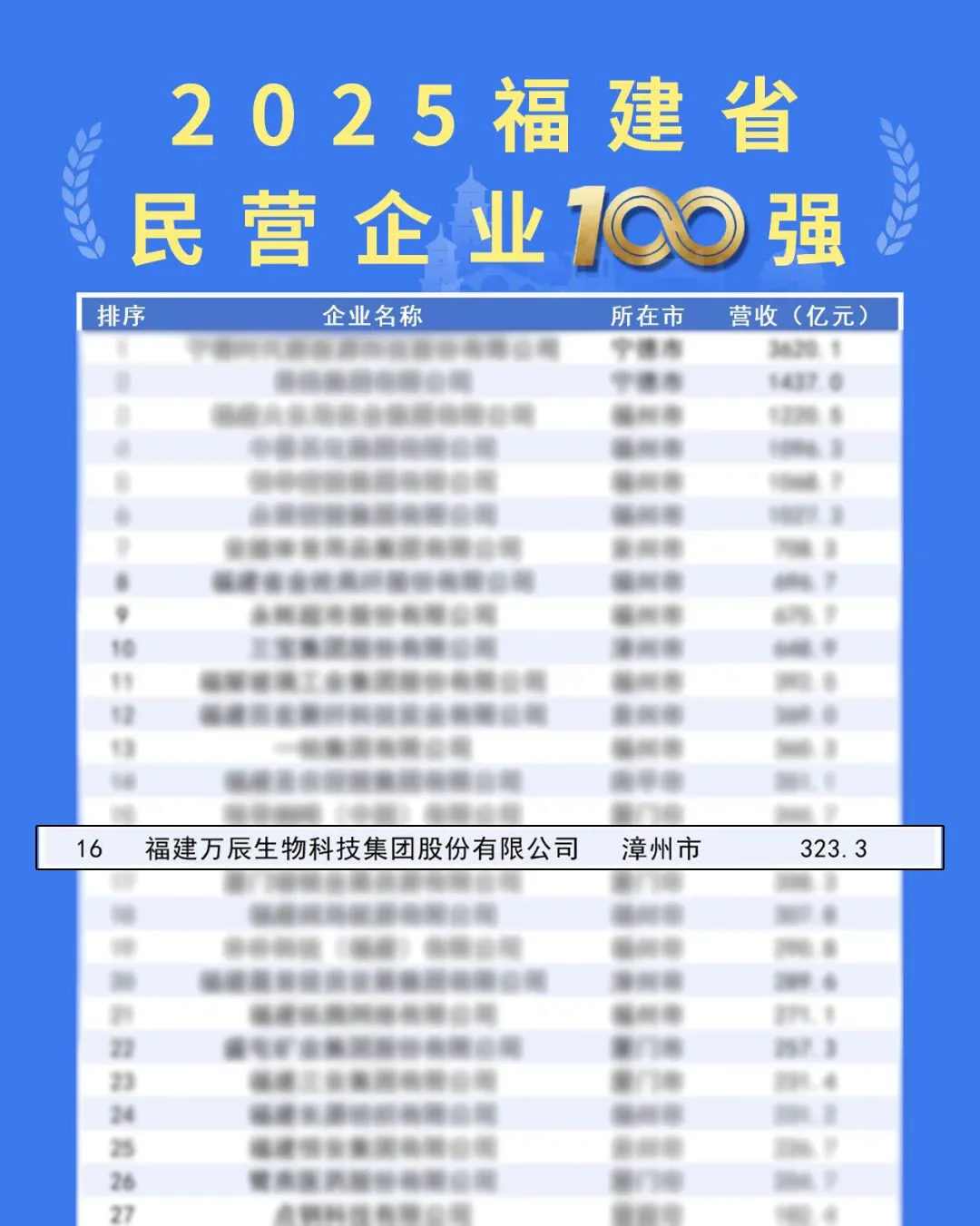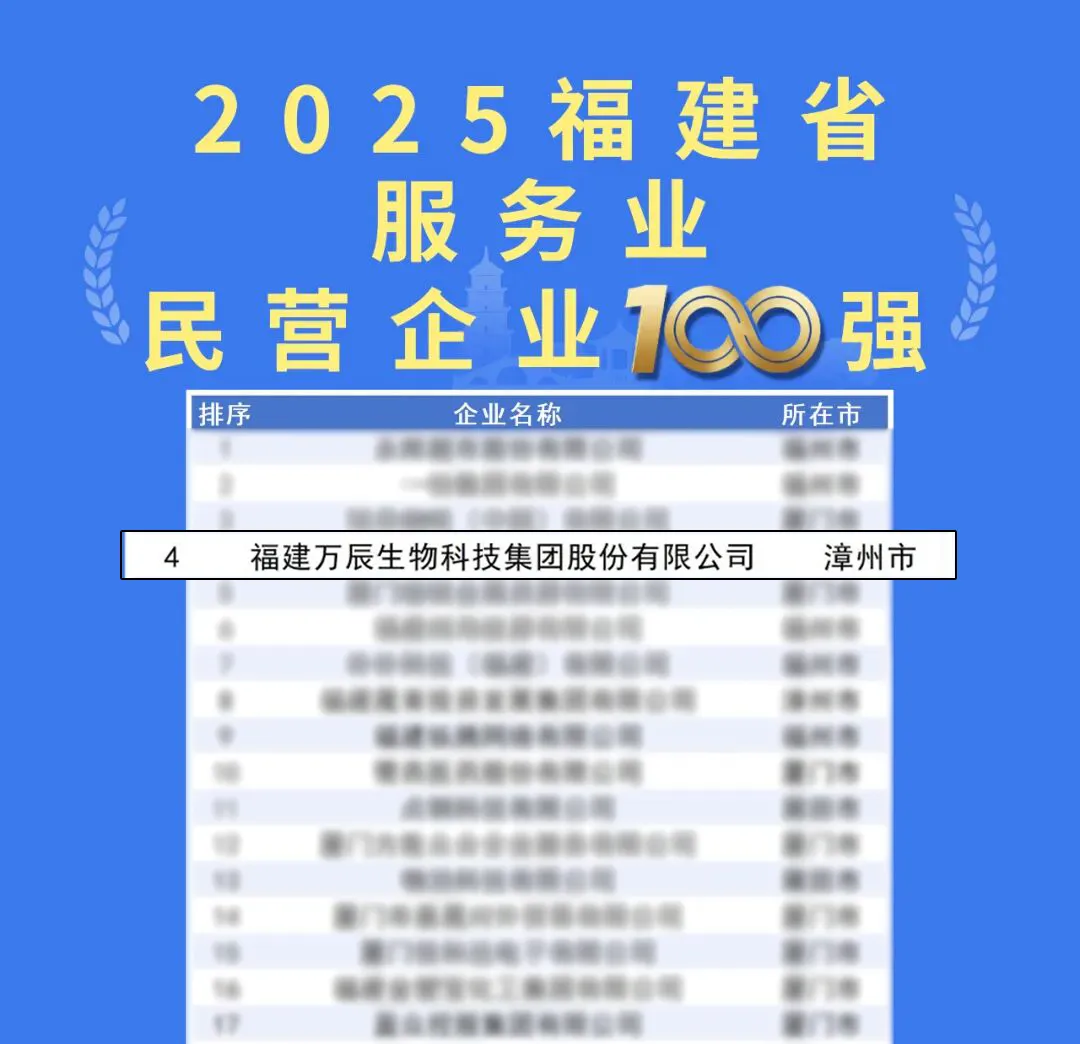 9月28日,2025福建省民營企業(yè)100強(qiáng)發(fā)布暨寧德市產(chǎn)業(yè)招商推介會在寧德舉行,會上福建省工商聯(lián)發(fā)布了2025福建省民營企業(yè)100強(qiáng)、制造業(yè)民營企業(yè)100強(qiáng)、服務(wù)業(yè)民營企業(yè)100強(qiáng)、創(chuàng)新型民營企業(yè)100強(qiáng)4個(gè)榜單。萬辰集團(tuán)登榜,位列2025福建民營企業(yè)100強(qiáng)第16位、2025福建服務(wù)業(yè)民營企業(yè)100強(qiáng)第4位。