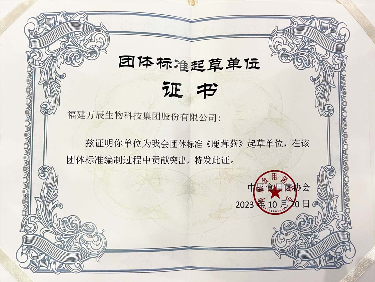 10月20日,萬辰集團受邀參加第4屆中國食用菌產(chǎn)業(yè)博覽會,喜獲中國食用菌協(xié)會頒發(fā)的鹿茸菇團體標(biāo)準(zhǔn)起草單位證書。